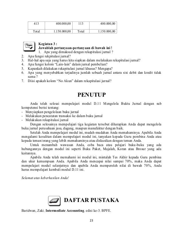 Pertanyaan pada kegiatan pendahuluan 1) pertanyaan guru berikut adalah kutipan, jenjang, dan macam pertanyaan yang diajukan, yakni sebagai berikut: Aktivitas keuangan dalam sistem buku besar dan pelaporan menghasilkan berbagai laporan manajerial.laporan pengendalian buku besar termasuk daftar voucher jurnal,dan daftar saldo akun buku besar.laporan ini digunakan untuk memverifikasi akurasi proses dan memasukannya ke buku besar. Pertanyaan tersebut akan terjawab jika anda pelajari tentang pencatatan transaksi keuangan ke dalam jurnal umum dan buku besar di blog jurnal by mekari. Jurnal umum pengertian jurnal umum jurnal umum merupakan sebuah jurnal yang digunakan untuk mencatat berbagai transaksi keuangan yang muncul dalam periode tertentu. Pada latihan membuat buku besar ini, akan digunakan jurnal umum dari latihan pembuatan jurnal umum sebelumnya latihan soal jurnal umum. Buku besar akuntansi adalah wadah alat buku tempat pemindahan akun yang berasal dari jurnal bentuk buku besar diantaranya adalah bentuk t dan bentuk staffelskontro. Jurnal umum diartikan sebagai buku harian atau formulir khusus yang digunakan untuk mencatat seluruh aktivitas transaksi secara kronologis dan sesuai urutan tanggal. Setiap subsistem siklus akuntansi yang dijelaskan dalam bab 12 sampai 15 menyediakan informasi mengenai transaksi reguler. 101+ contoh soal buku besar pembantu piutang dan jawabannya + jawaban.bukti transaksi yang mengakibatkan perubahan utang dan juga piutang perusahaan sampai ke tahap buku besar pembantu piutang dan buku besar pembantu utang melalui prosedur sebagai berikut buku pembantu memiliki fungsi untuk menyediakan rincian dari buku besar umum. Mungkin artikel ini bisa d gunakan untuk menambah pengetahuan tentang penyusunan… Perlu diketahui kalau pencatatan transaksi keuangan secara teratur memegang peranan penting untuk melengkapi laporan keuangan yang dapat dimanfaatkan sebagai kepentingan bisnis. Sejarah buku besar umum, dan input langsung (jurnal penyesuaian dan jurnal penutup) dari kelompok pelaporan keuangan, termasuk neraca, laporan laba rugi, dan laporan aruskas. Pertanyaan tentang buku besar dan neraca saldo.